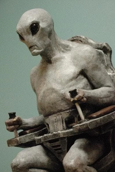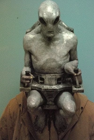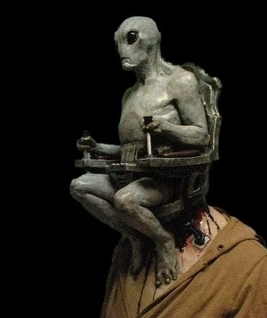 A little grey alien sits at the controls and directs his human host to commit violent acts in the name of colonization. Blood seeps out of the victim’s neck while the otherworldly devil fulfills his mission. Can this man be freed, or has too much of his brain been destroyed?