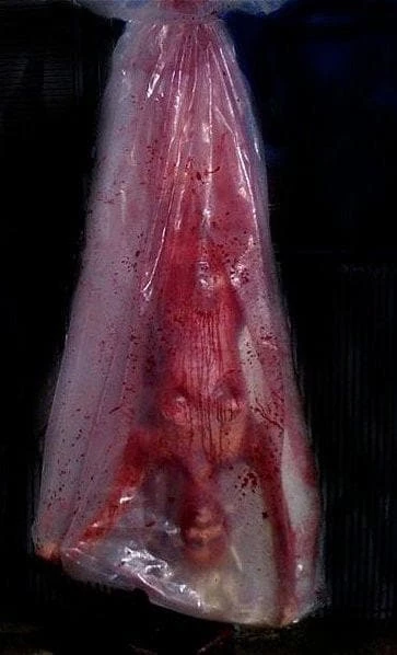 Life-size inverted female body Halloween Animatronic, covered with a bloody thick plastic bag. This gruesome prop is not for the faint of heart! Made of durable latex foam. Measures approximately 84 inches long. This item is handmade and may vary slightly from shown.