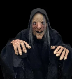 Don’t go walking into the woods alone, or you may have a Cauldron CAT-tastrophe on your hands! This sinister sorceress stands before her bubbling black cauldron with flickering “smoldering coals” while holding a mangy cat by the feet. The witch is dressed in a mottled-brown and black dress with rope belt, a shredded-gauze shawl, a creepy bone necklace and a matching pointed hat. This scary decoration is easy to assemble with quick-connect poles and includes volume control. With several spooky sayings, one must be careful not to get in the way of this powerful witch! Animation: Eyes light up, Head and torso turn from side-to-side, Mouth moves, Cat hisses and flails over the green bubbling cauldron. Prop will say one of three sayings with each activation: “(evil laughter)”: “Eh heh heh heh you will make a tasty meal – my favorite is the flesh from a black cat, but you will do nicely! Eh heheheheh!”: “See what happens when you cross my path? Let this be a lesson to you – and a meal for me! Eh heheheh!”). Activation options: Steady-on, Infra-red sensor (works up to 6.5′ feet away & works in all lighting conditions), Step-here pad (included). Power: UL power adapter that plugs into any standard outlet. Materials: Iron, PVC, polyester and cotton. Assembly required.