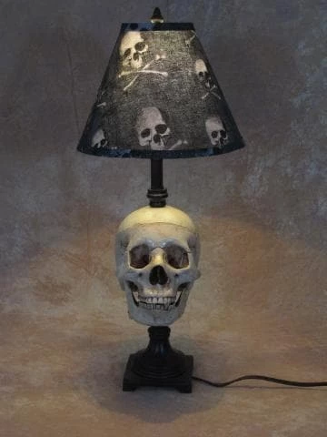 Unique Skull Desk lamp with Skull Cross Bone Shade is a must for almost any one serious in the haunt business. Uses standard 40 watt bulb, not included. Can use either eerie yellow bulb, as shown, or standard white light. 23″ tall by about 10″ wide. Weight is 5.25 pounds.