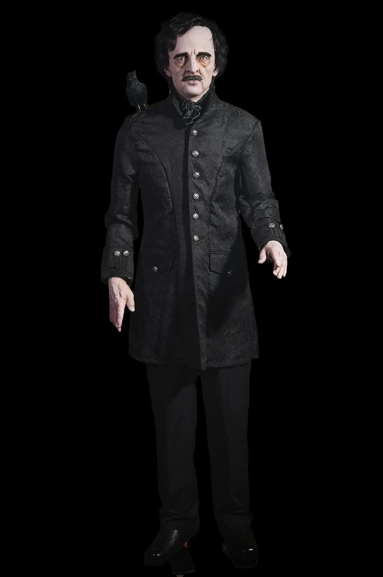 This quality Edgar Allan Poe standing prop display is new in 2021. Standing over 6 ft. tall this realistic sculpt is by Jordu Schell, and is handcrafted and painted. Includes the bird on his shoulder! Perfect for fans, collectors, and museums.