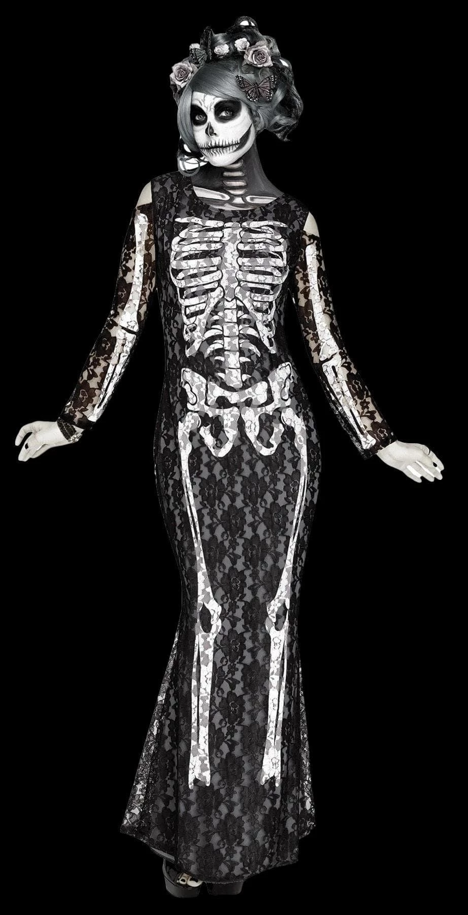 Looking for a woman’s Halloween costume that is beautiful and doesn’t show too much? This elegant skeleton dress is a perfect choice! The floor length cold-shoulder dress is made from a sheer black lace with gray underlay and features a white skeleton print on the front. Add your own skeleton makeup to complete the look.
