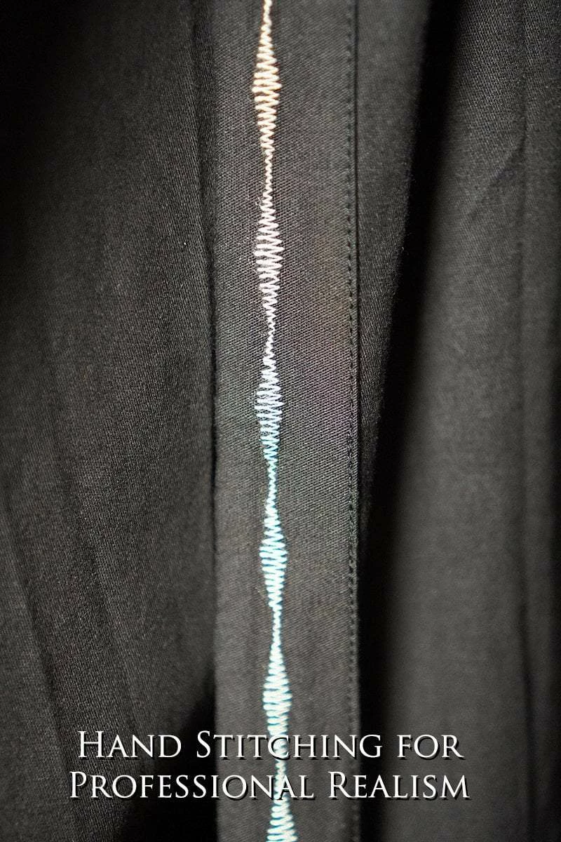 This Professional robe is Movie-Quality with hand-stitched designs, sewn-in shoulder padding to give the appearance of a wider build and sewn in wire to keep the hood up in a standup position. The stonewashed material has been meticulously stressed, stained and discolored to give the appearance of age.