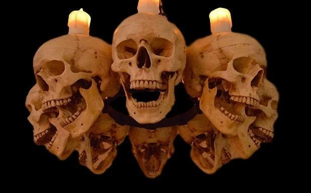 Life-size Skull chandelier made with eight skulls in a circular pattern, all looking slightly down with jaws open in horror. The skulls form a circle that measures 23” in diameter and is 14” tall from bottom of jaw to tip of candle.